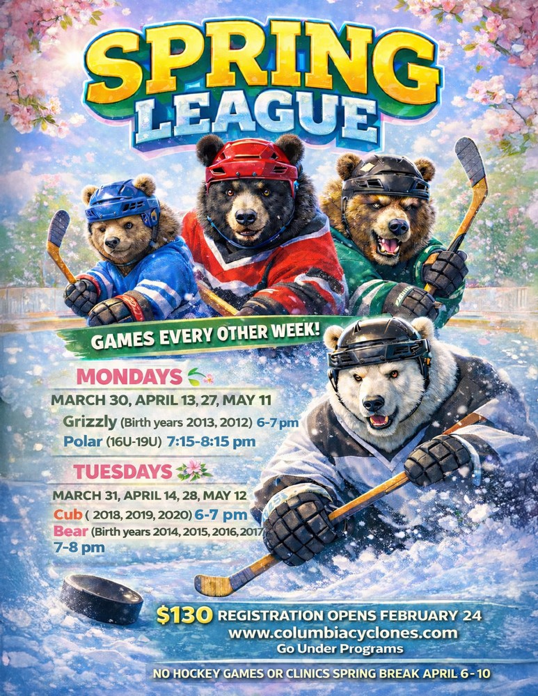 Join us for 4 weeks of Spring league. Each week we will host a game 55-60 mins long. Depending on the number of participants in each division the games may be 3v3, 4v4, or classic 5v5. Teams will change each week, and we will do our best to divide up skill level, so teams are as even as possible. We ask that you not wear your Cyclone jerseys, we provide Black and white jerseys for players to wear each week. This is a great opportunity to volunteer- we will need volunteers for clock, music, adults to sit the bench, and snacks.